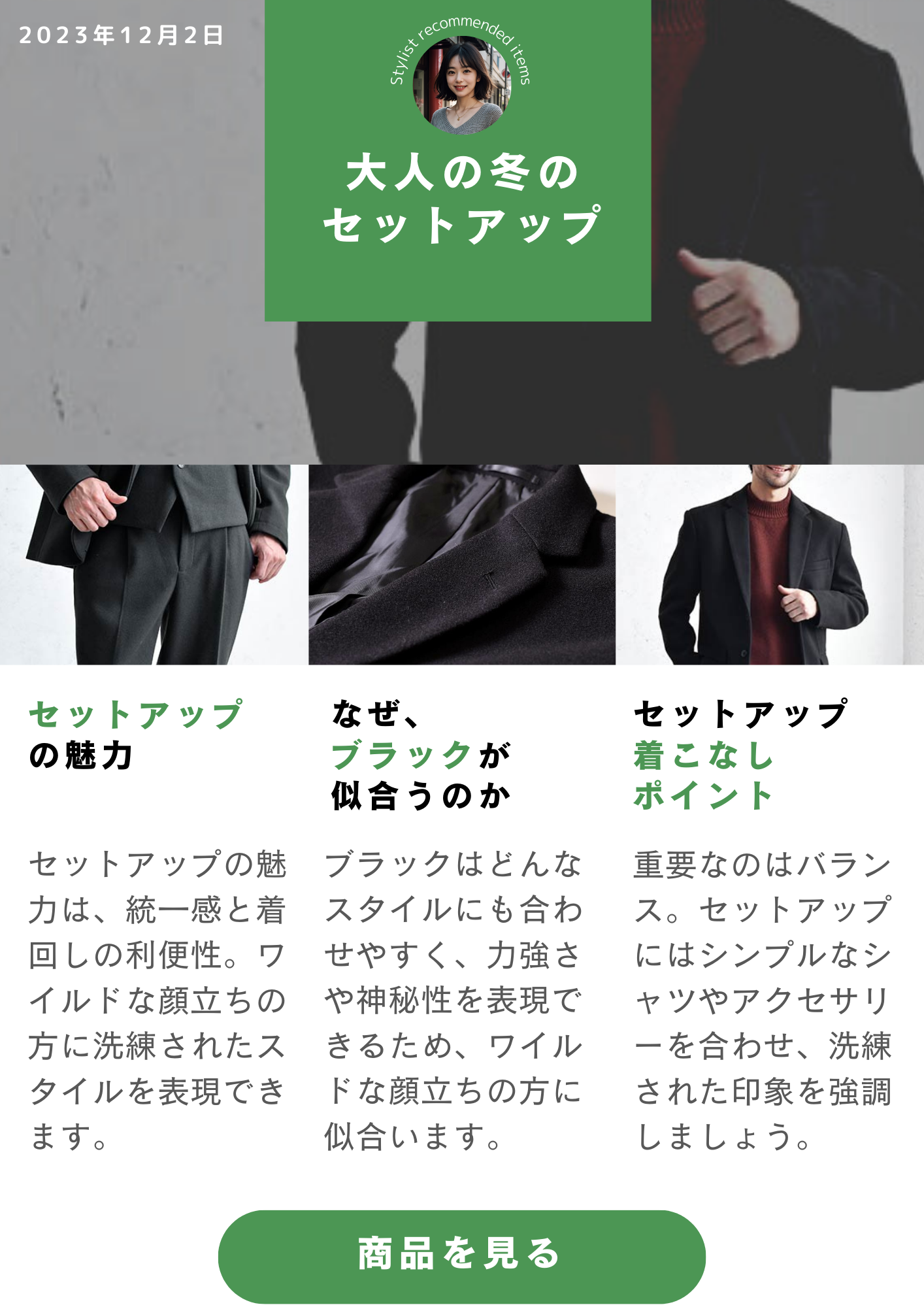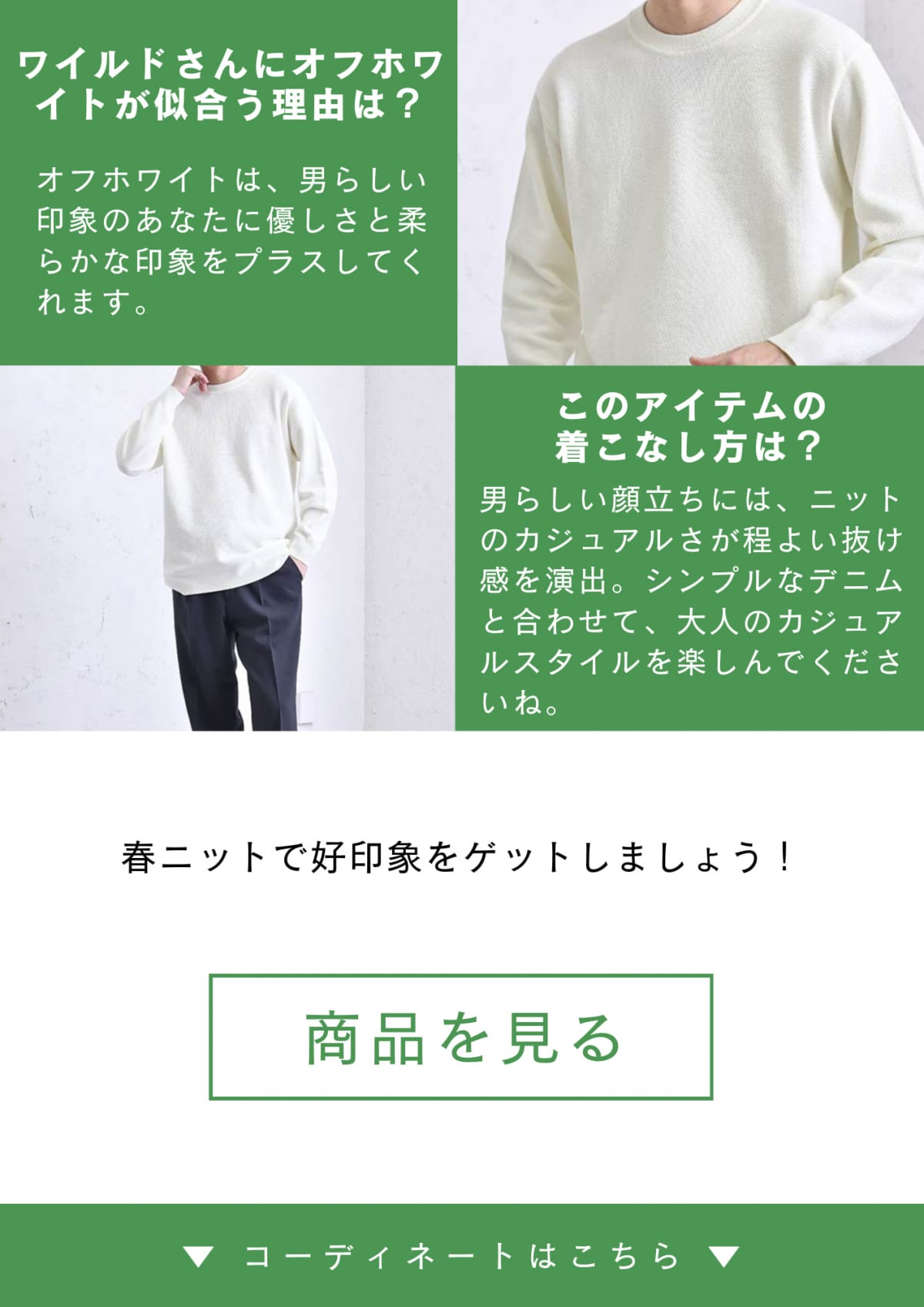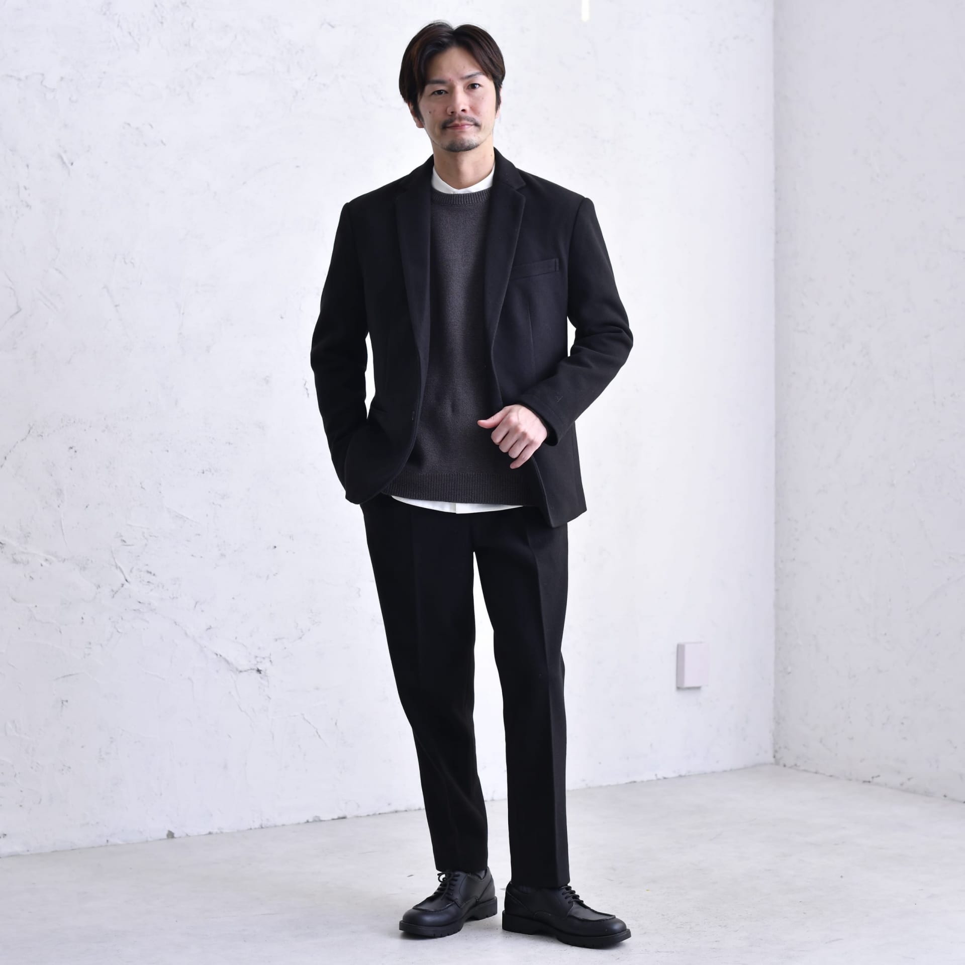 オフホワイトのニットに、ディープチャコールのテーラードジャケットを合わせて、落ち着きのある男らしさを演出しましょう。パンツもディープチャコールで統一感を持たせ、ブラックのプレーントゥシューズでシックに仕上げます。