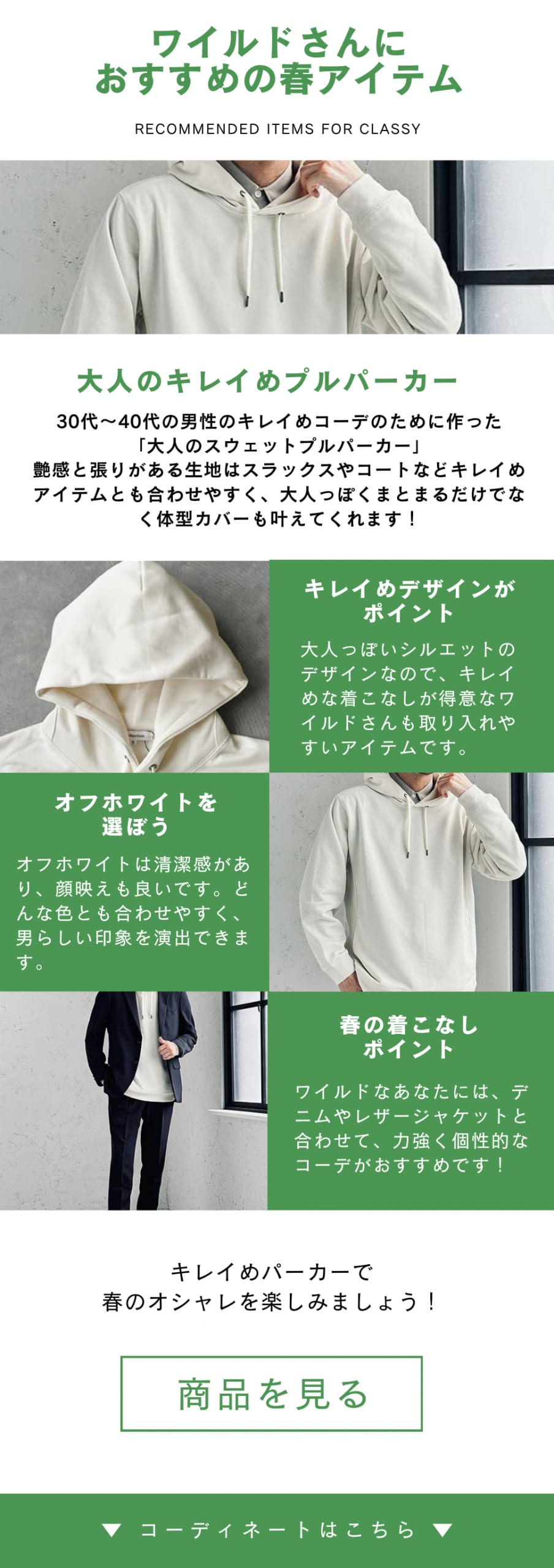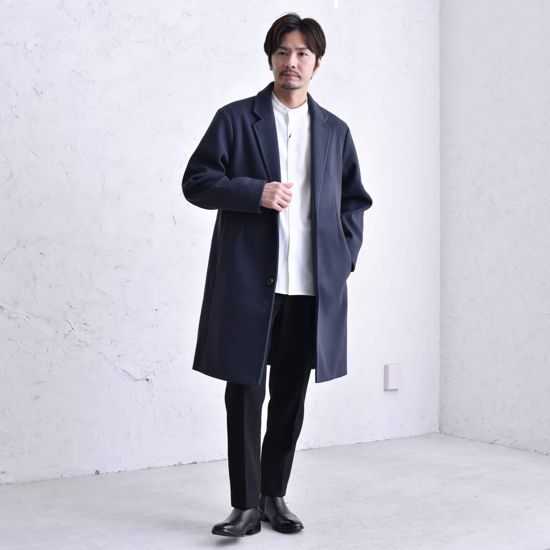 ネイビーのチェスターコートは、大人の男らしさを演出します。オフホワイトのキレイめプルパーカーを合わせて、ワイルドさを優雅に表現しましょう。