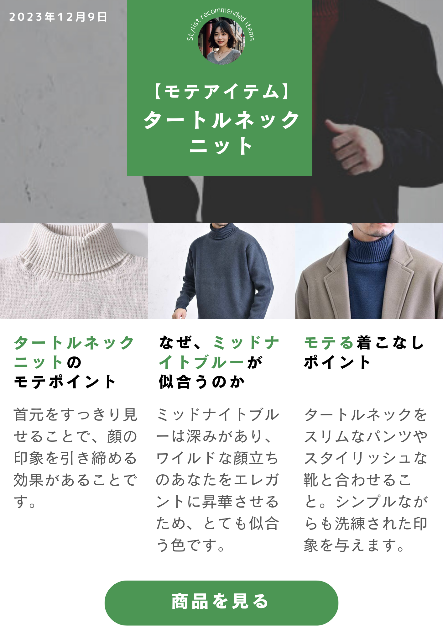 深みのあるミッドナイトブルーのニットが上品な雰囲気を醸し出し、ブラックのテーパードパンツでスマートな印象。グレージュのコートで温かみを添えることで女性からの目を惹きます。