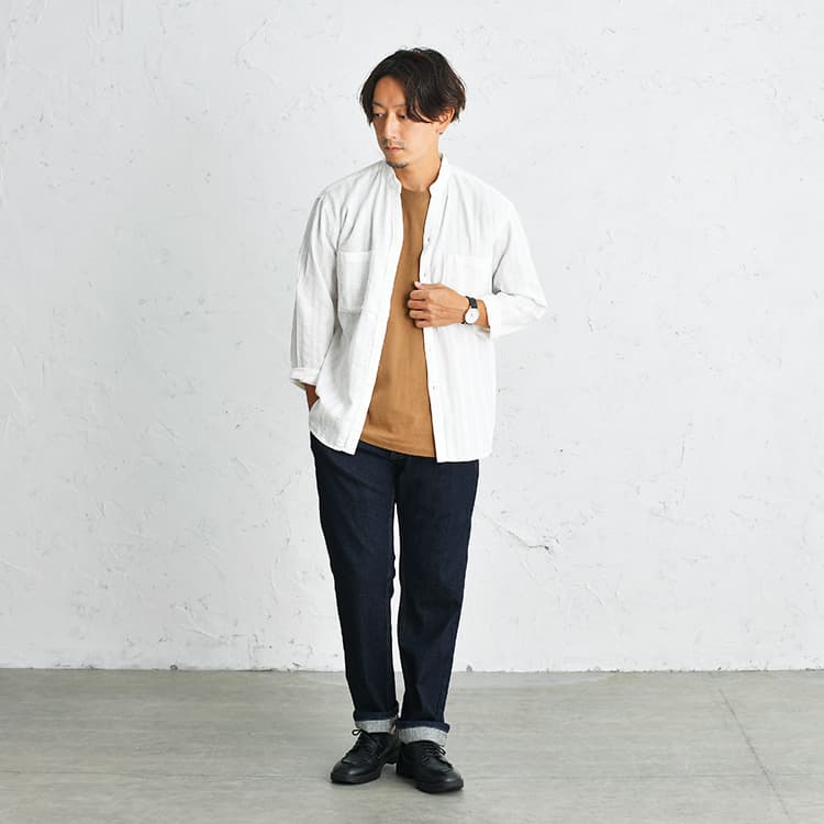 ストレートさんにおすすめ!バンドカラーシャツのキレイめコーデ