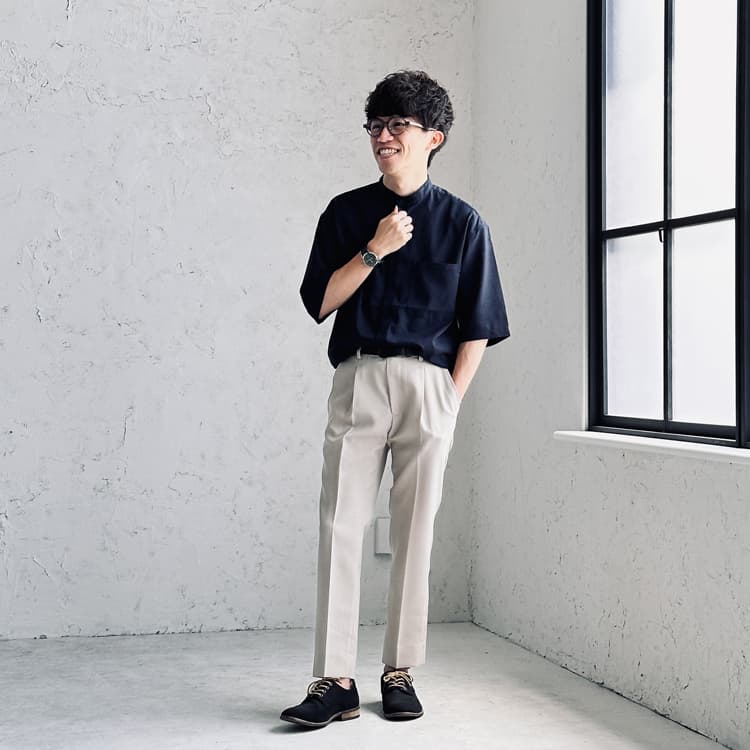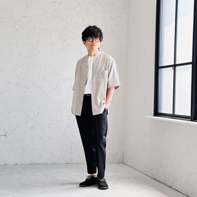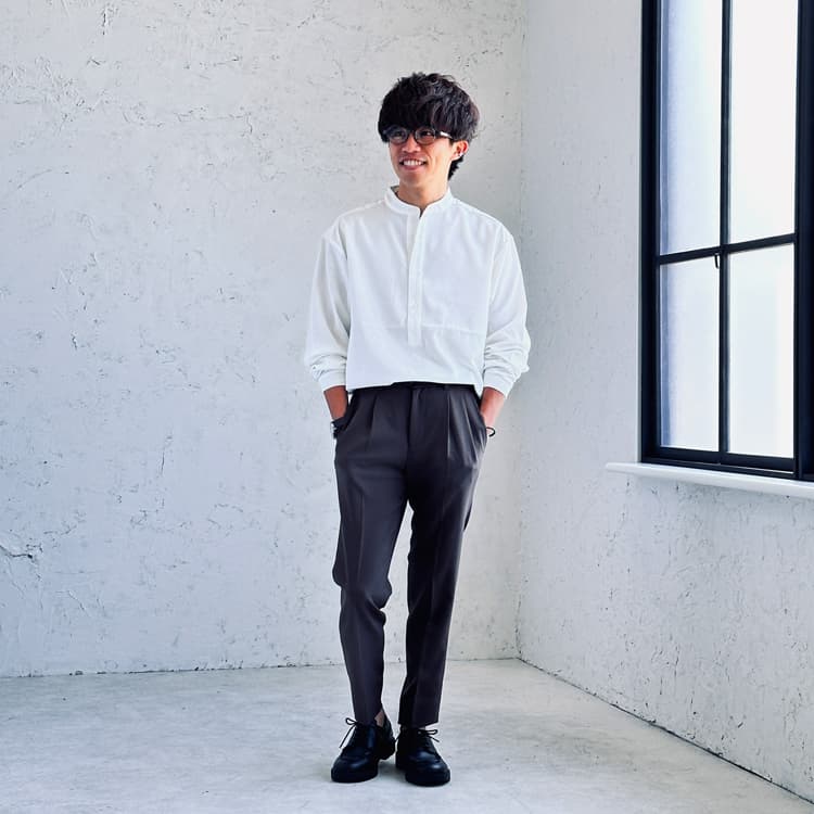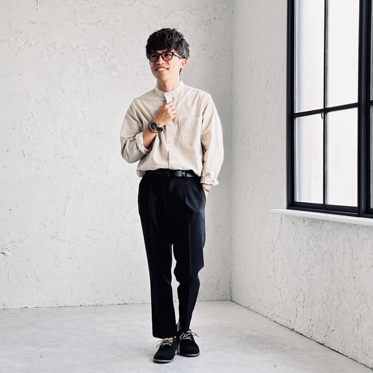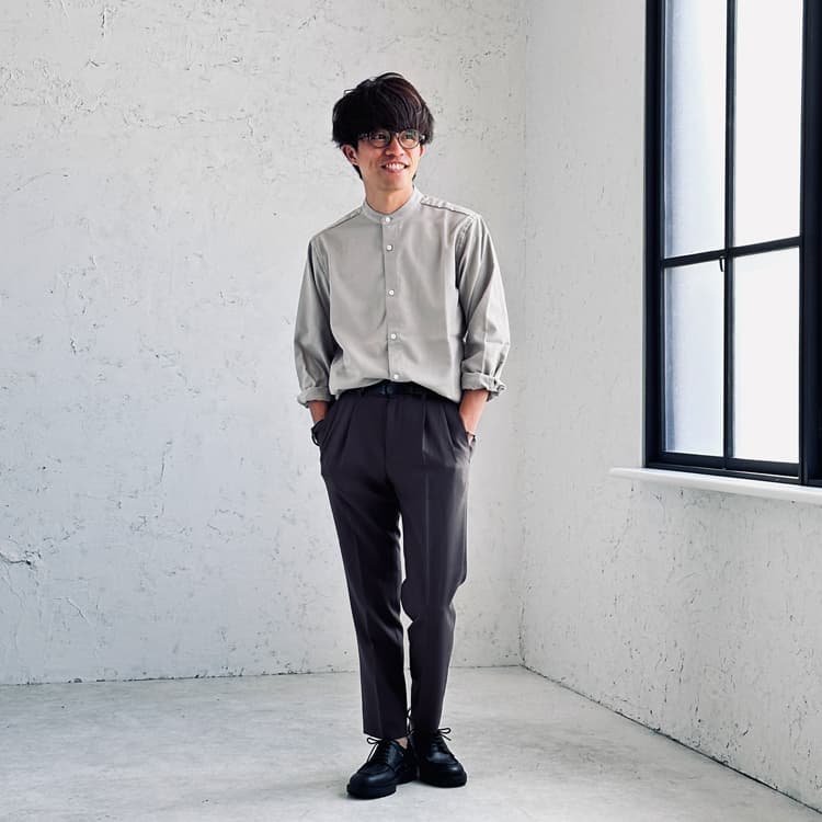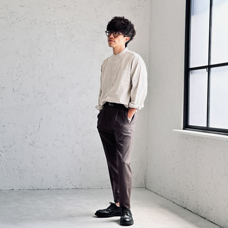 バンドカラーシャツ×テーパードパンツでつくるキレイめカジュアルコーデ
