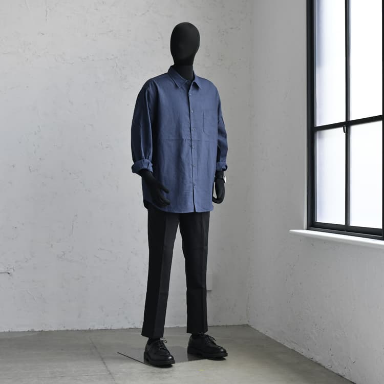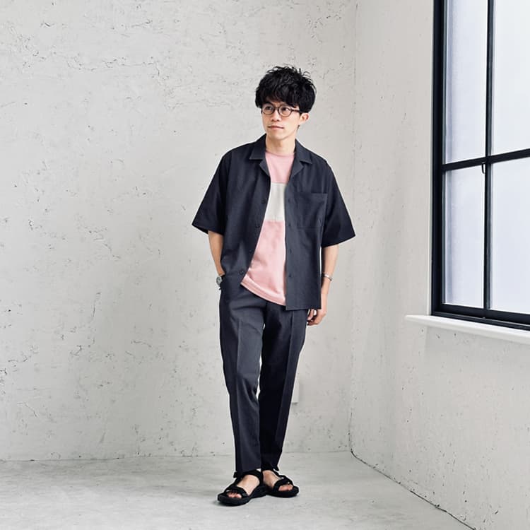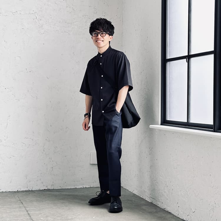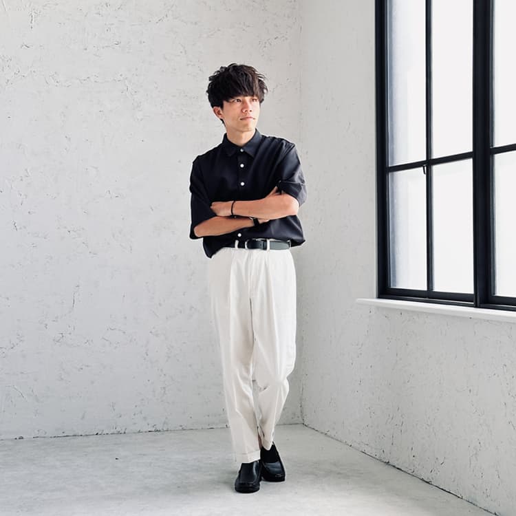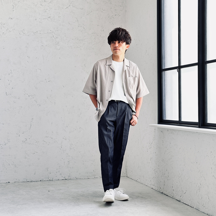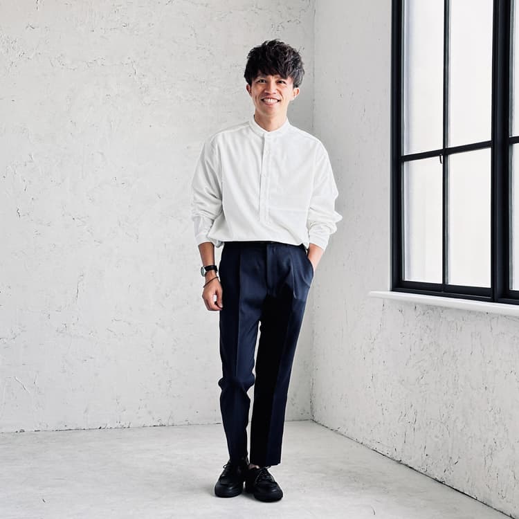 バンドカラーシャツ×テーパードパンツでつくるキレイめカジュアルコーデ