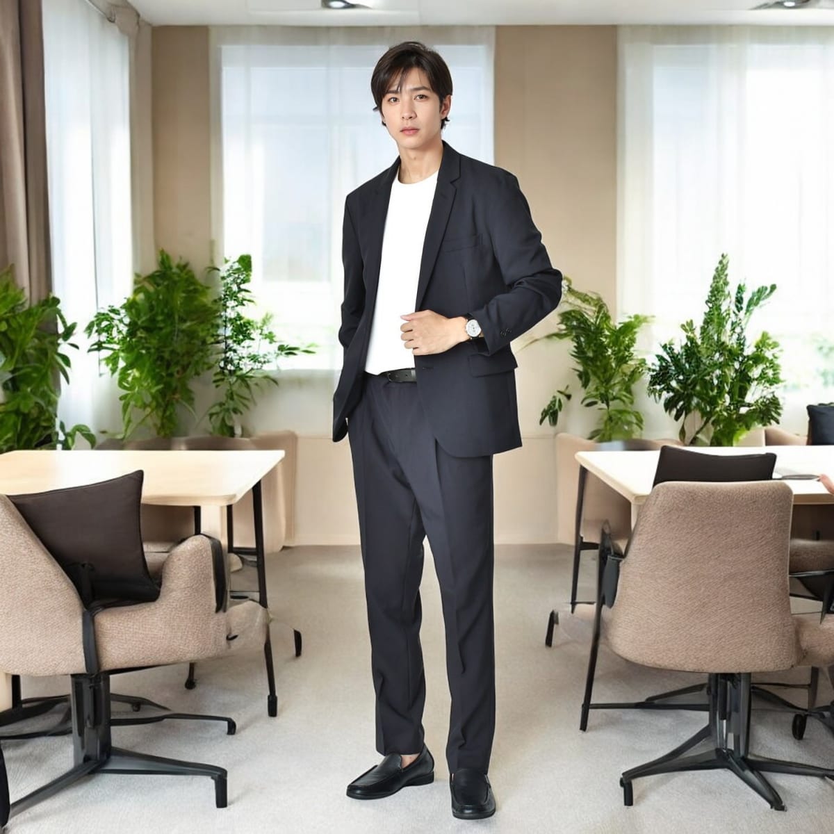 黒ベルトで引き締める大人セットアップ