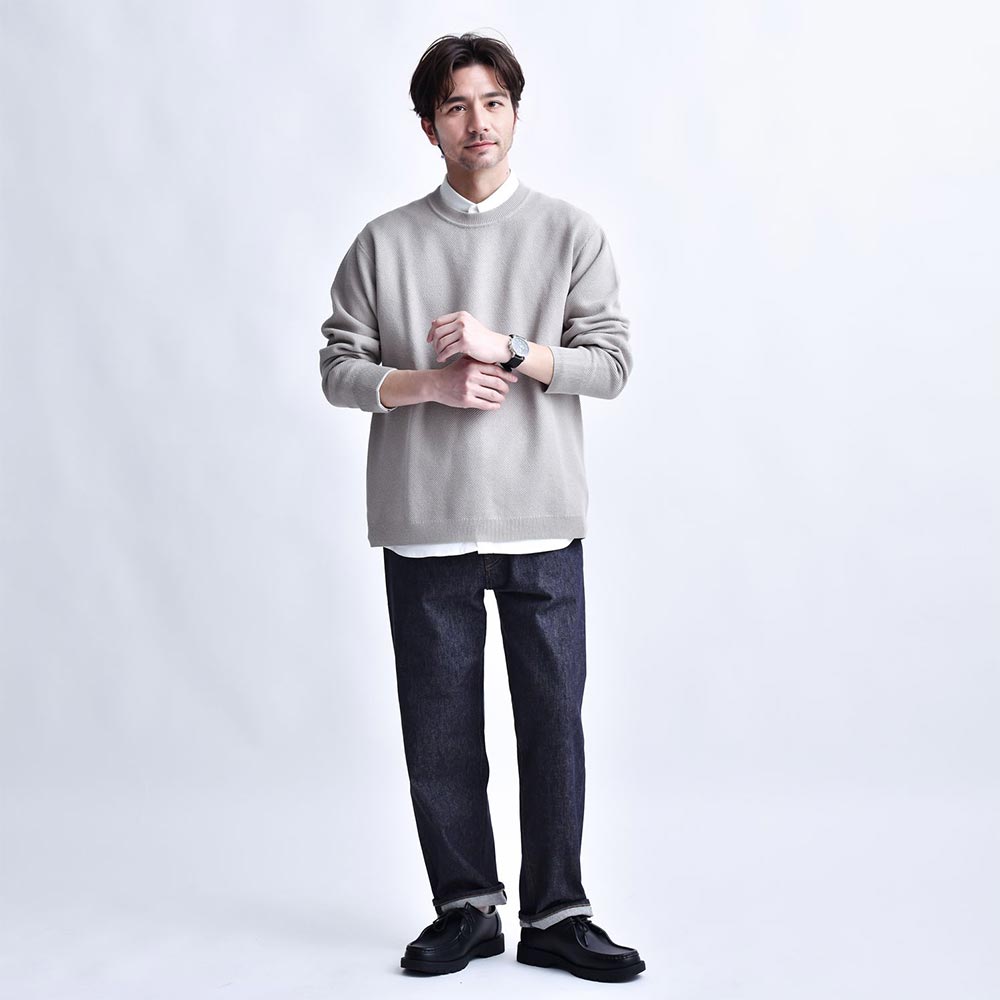 ニット×シャツでラフな春コーデ。
