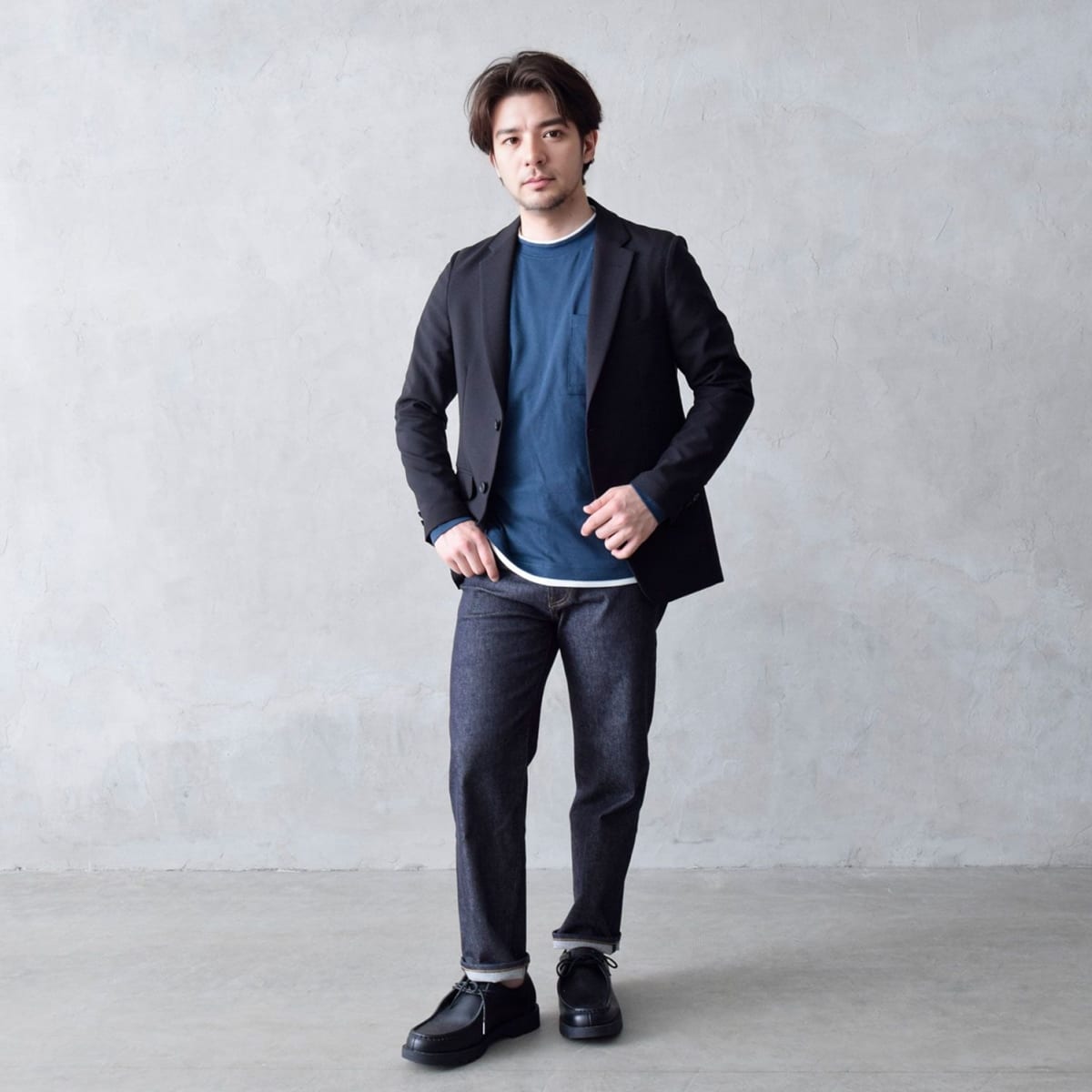 黒ジャケットをカジュアルに着こなして。
