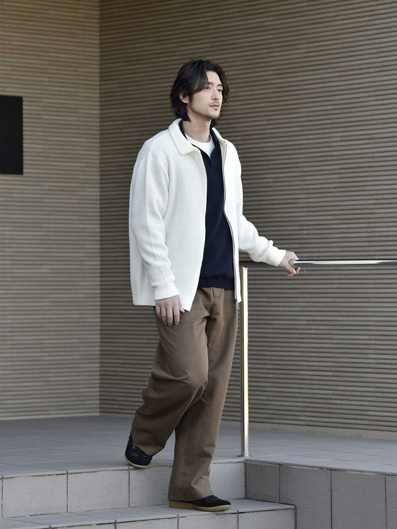 アイボリーのジップアップニットとテーパードパンツのコーデ