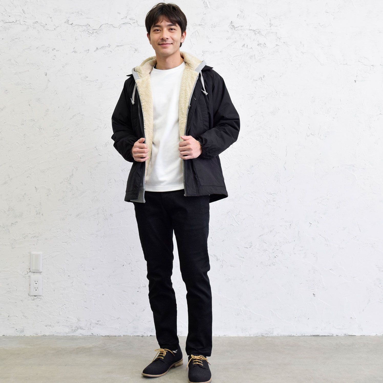 タフでカッコいい!パンツで変化をつける黒マウンテンパーカーコーデ