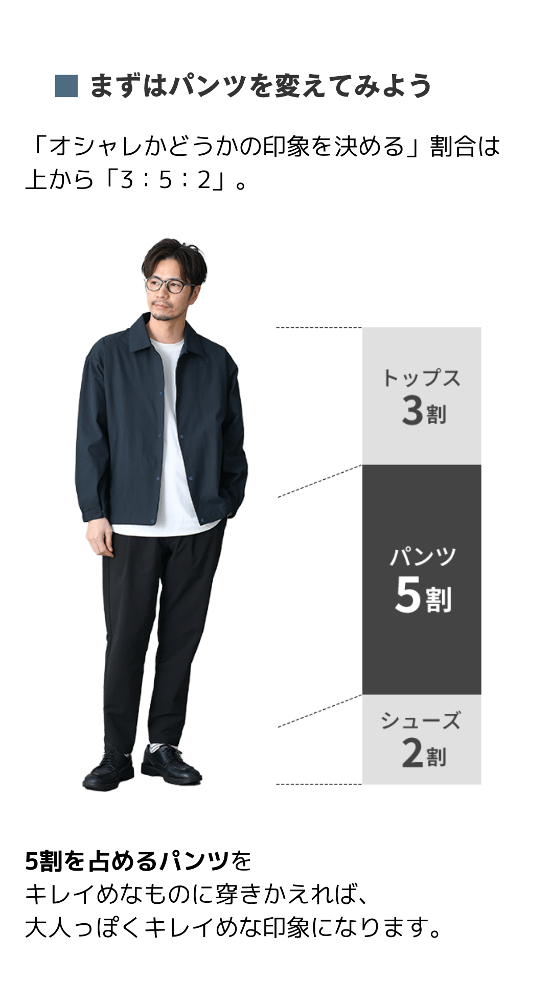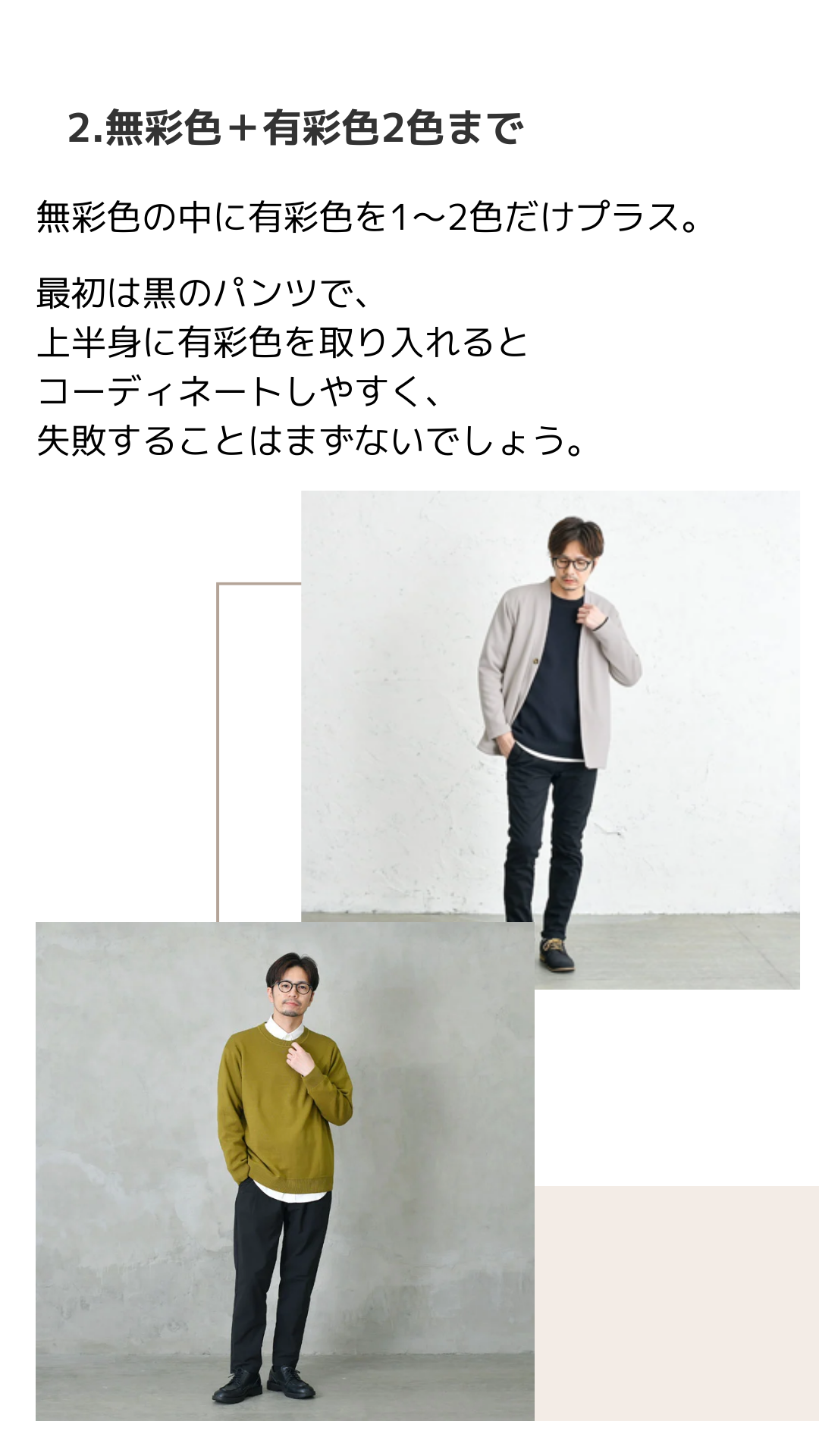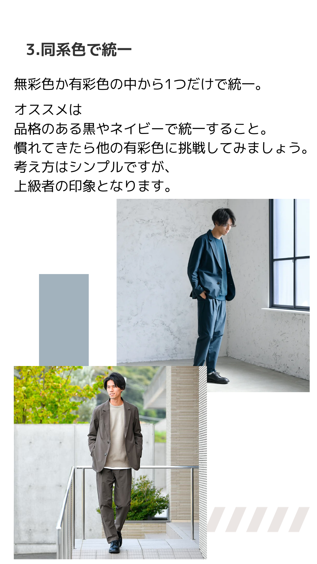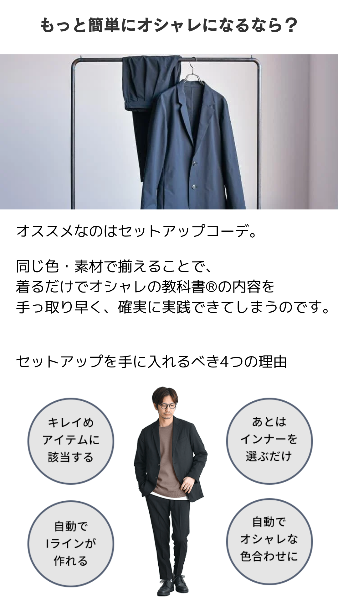 FASHION BASIS SECTION1 大人のオシャレに必要なこと 「最近、自分のファッションがしっくりこない」 「忙しくてオシャレに気を配る時間がない」 そんな風に感じたことはありませんか? もしそうだとしたら今こそ、魅力的な大人のオシャレをする絶好のタイミングです。 若い頃の服を続けると 「おじさん化」してしまう 若い頃と同じ服を着続けていると、年齢とともにそのスタイルが時代遅れに見えてしまいます。トレンドや価値観が変わっていく中で、過去の感覚に固執していると、周囲からおじさん化して見られるようになってしまいます。 大人の魅力を引き出すチャンス しかし今、あなたが「価値観」を更新し、ファッションの力で周囲からの印象を一変させるチャンスです。大人の魅力を引き出し、周りの人から「オシャレですね」「素敵ですね」と思われるようなスタイルを手に入れましょう。 私たちの実績 初めまして、私たちは会員登録33万人、アプリダウンロード40万件のファッションブランドを運営しています。(2024年8月時点) これからファッションのプロである私たちが「オシャレの原理原則」を紹介します。 大人のオシャレに必要なのは 2つの原理原則 調和は人間の本能的な美の基準です。 例えば芸術の分野では、黄金比と呼ばれる視覚的な調和が保たれ、そのデザインが美しいとされています。 社会では、礼儀作法によって人との関係や状況に社会的な調和が保たれ、その姿が美しいとされています。 2つの原理原則とは? ファッションも同じで調和のとれたコーディネートがオシャレ、魅力的とされています。 調和のとれたコーディネートに必要なのは「2つの原理原則」です。 2つの原理原則を満たせば、自動的に調和のとれたシルエットや色のバランス、TPOに合った装いが完成し美しいと感じさせます。 2つの原理原則を理解し実践するだけで自然に周囲から「オシャレだな」と思われるようになるのです。 高価な服は必要ない 「大人のオシャレな服は高いんじゃない?」と心配するかもしれませんが、高い服を買えばオシャレになれるわけではありません。全身2万円以内でも、2つの原理原則を押さえれば、あなたは間違いなく洗練された大人のオシャレを手に入れられます。 原理原則の続きは公式LINEで ここまでお読みいただき、ありがとうございます。 2つの原理原則の詳細を解説する「SECTION2以降」は、LINE公式アカウントで友だち登録された方限定で無料でお読みいただけます。 さらに、LINEではあなたにおすすめのコーディネート例や、大人が最初に買うべき洋服も知ることができます。 今すぐ友だち登録をして、オシャレをさらにレベルアップしましょう! LINEで友だち登録する