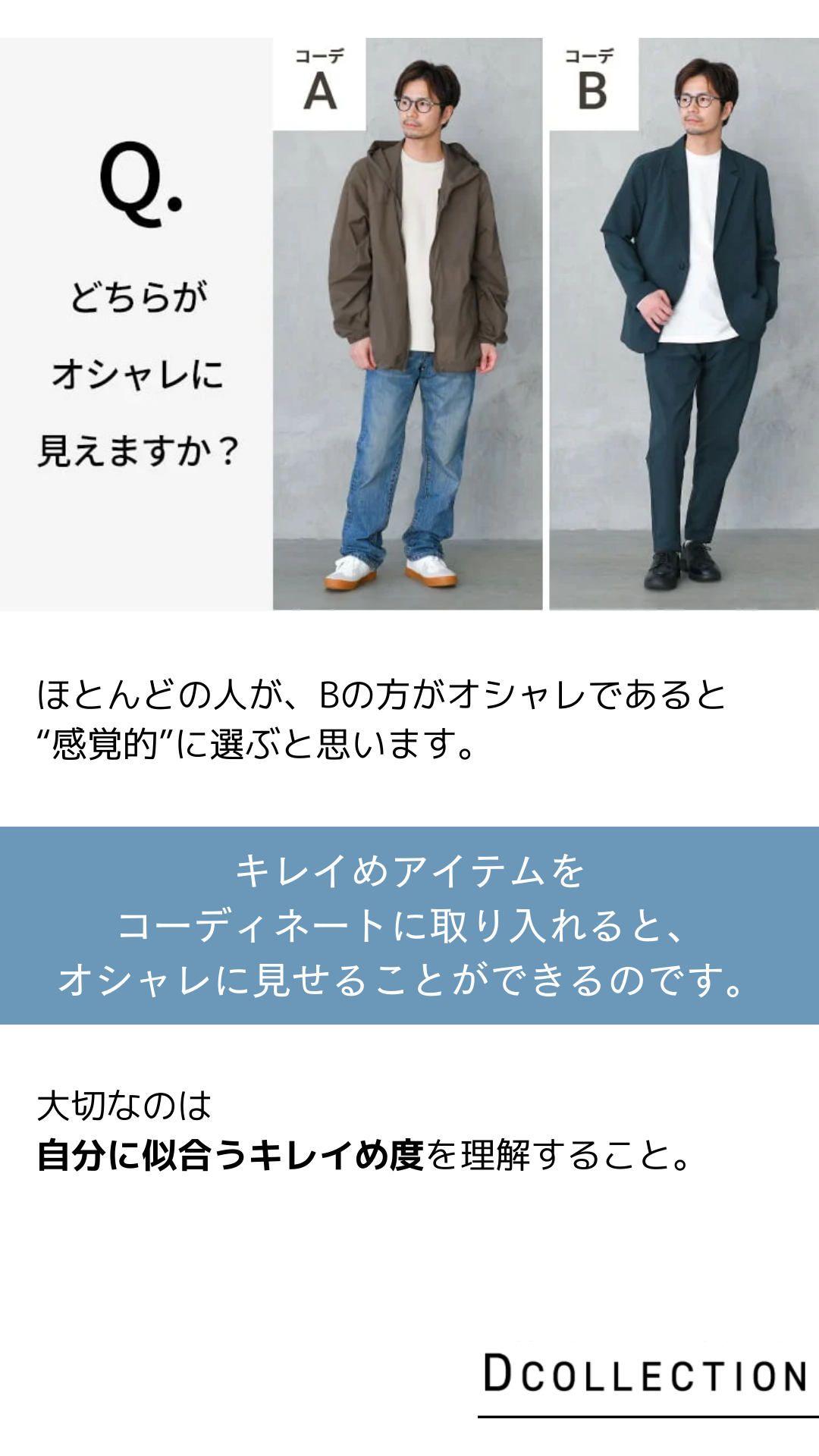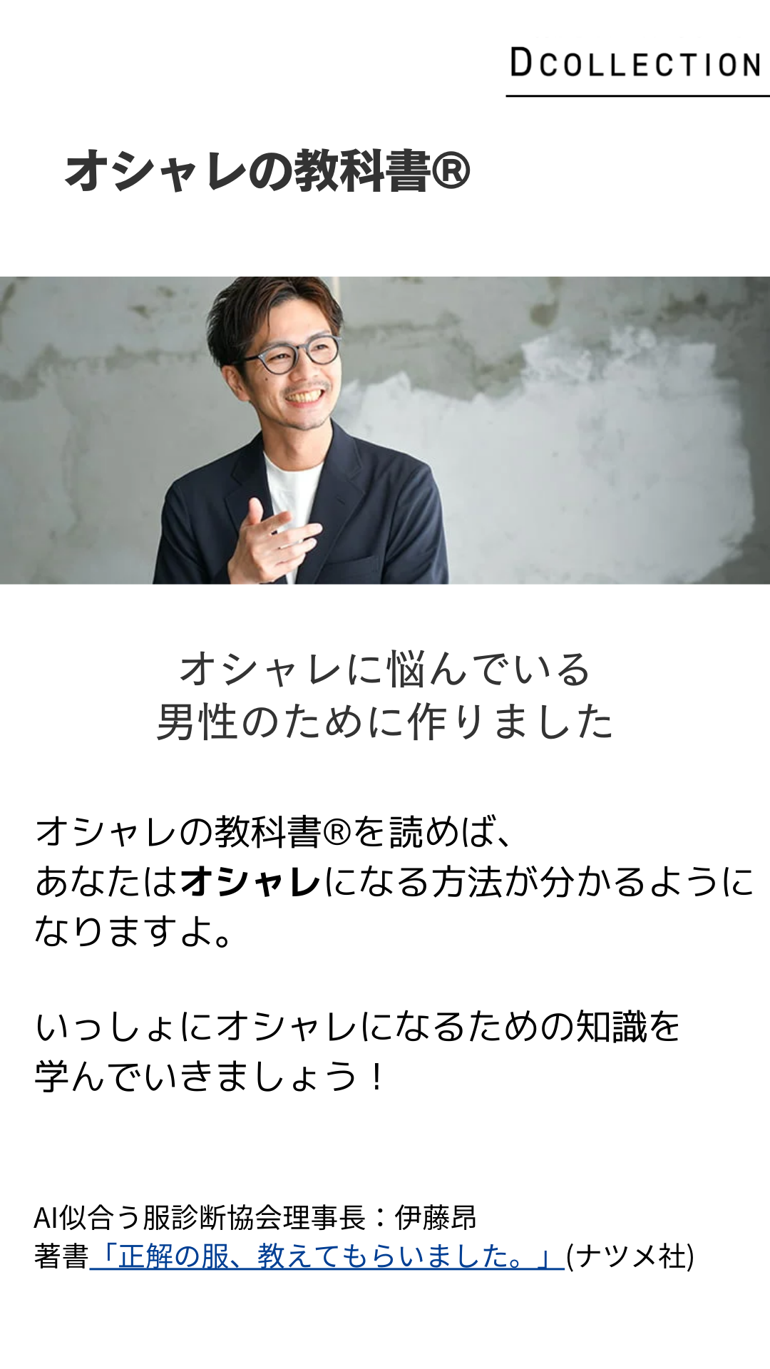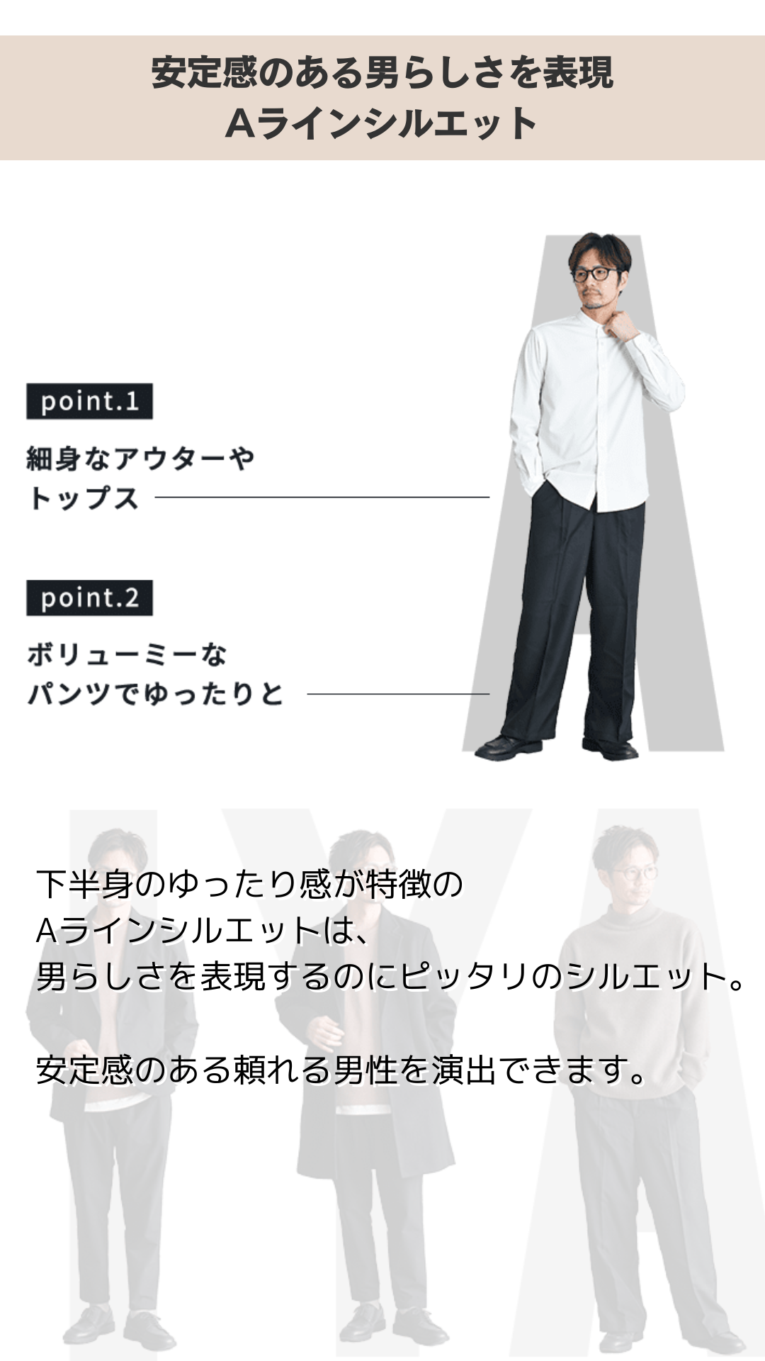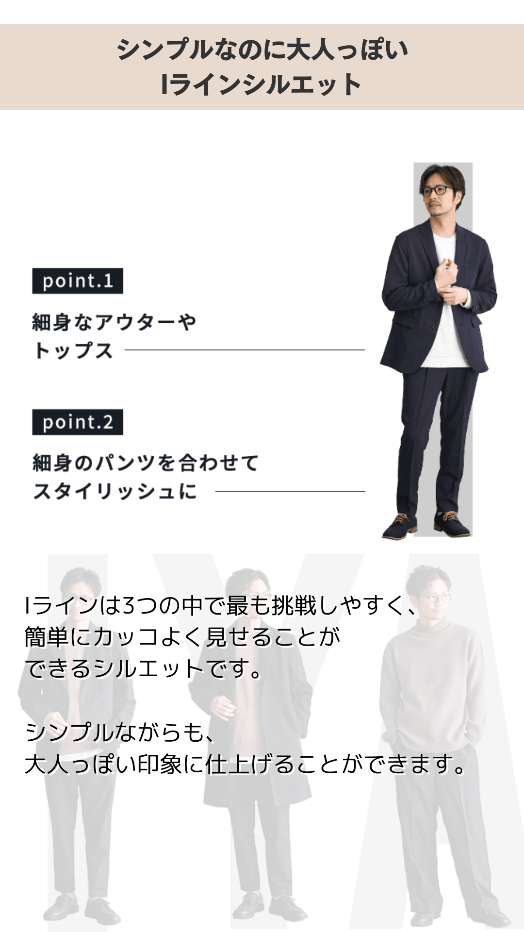 FASHION BASIS SECTION1 大人のオシャレに必要なこと 「最近、自分のファッションがしっくりこない」 「忙しくてオシャレに気を配る時間がない」 そんな風に感じたことはありませんか? もしそうだとしたら今こそ、魅力的な大人のオシャレをする絶好のタイミングです。 若い頃の服を続けると 「おじさん化」してしまう 若い頃と同じ服を着続けていると、年齢とともにそのスタイルが時代遅れに見えてしまいます。トレンドや価値観が変わっていく中で、過去の感覚に固執していると、周囲からおじさん化して見られるようになってしまいます。 大人の魅力を引き出すチャンス しかし今、あなたが「価値観」を更新し、ファッションの力で周囲からの印象を一変させるチャンスです。大人の魅力を引き出し、周りの人から「オシャレですね」「素敵ですね」と思われるようなスタイルを手に入れましょう。 私たちの実績 初めまして、私たちは会員登録33万人、アプリダウンロード40万件のファッションブランドを運営しています。(2024年8月時点) これからファッションのプロである私たちが「オシャレの原理原則」を紹介します。 大人のオシャレに必要なのは 2つの原理原則 調和は人間の本能的な美の基準です。 例えば芸術の分野では、黄金比と呼ばれる視覚的な調和が保たれ、そのデザインが美しいとされています。 社会では、礼儀作法によって人との関係や状況に社会的な調和が保たれ、その姿が美しいとされています。 2つの原理原則とは? ファッションも同じで調和のとれたコーディネートがオシャレ、魅力的とされています。 調和のとれたコーディネートに必要なのは「2つの原理原則」です。 2つの原理原則を満たせば、自動的に調和のとれたシルエットや色のバランス、TPOに合った装いが完成し美しいと感じさせます。 2つの原理原則を理解し実践するだけで自然に周囲から「オシャレだな」と思われるようになるのです。 高価な服は必要ない 「大人のオシャレな服は高いんじゃない?」と心配するかもしれませんが、高い服を買えばオシャレになれるわけではありません。全身2万円以内でも、2つの原理原則を押さえれば、あなたは間違いなく洗練された大人のオシャレを手に入れられます。 原理原則の続きは公式LINEで ここまでお読みいただき、ありがとうございます。 2つの原理原則の詳細を解説する「SECTION2以降」は、LINE公式アカウントで友だち登録された方限定で無料でお読みいただけます。 さらに、LINEではあなたにおすすめのコーディネート例や、大人が最初に買うべき洋服も知ることができます。 今すぐ友だち登録をして、オシャレをさらにレベルアップしましょう! LINEで友だち登録する