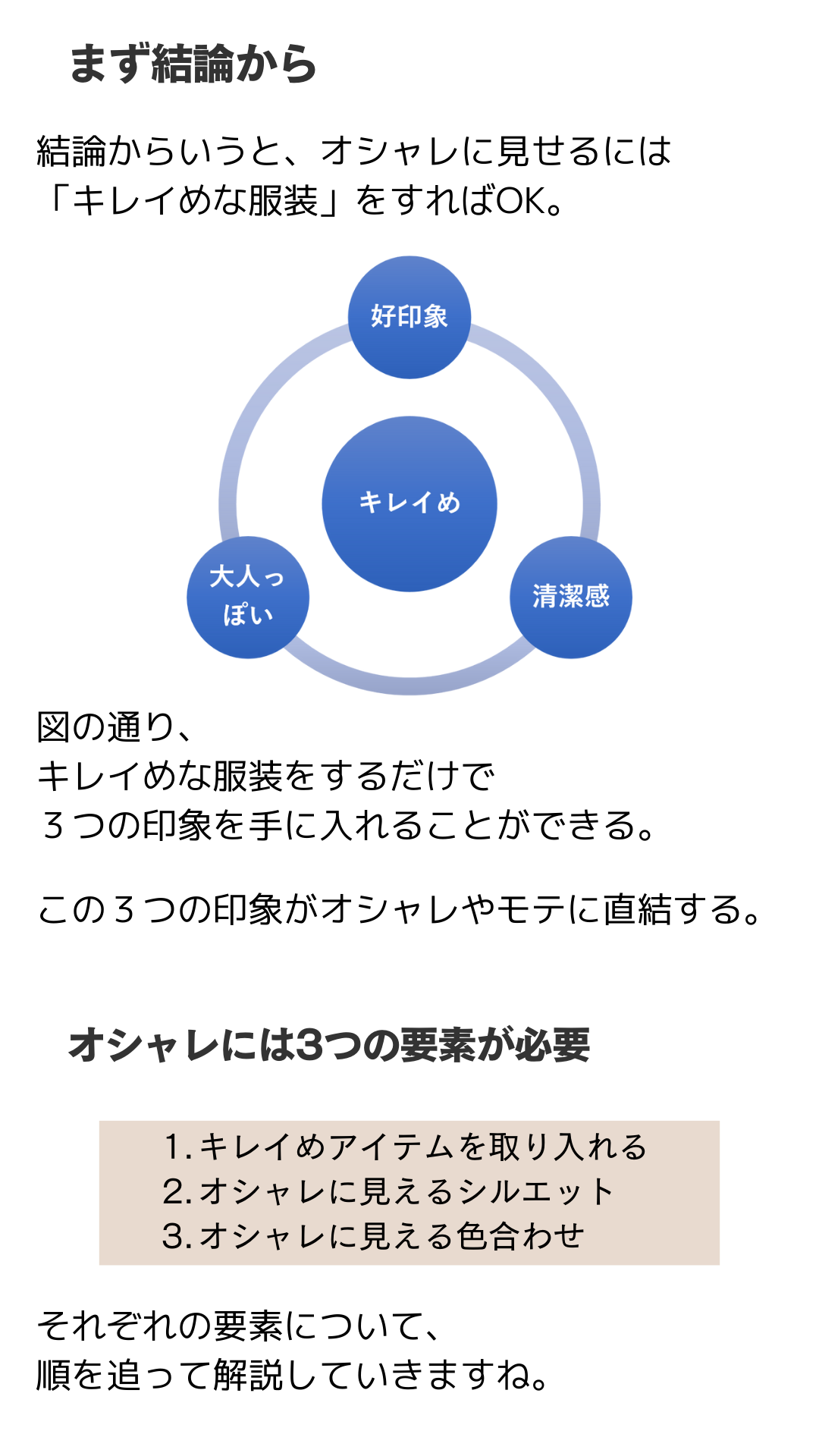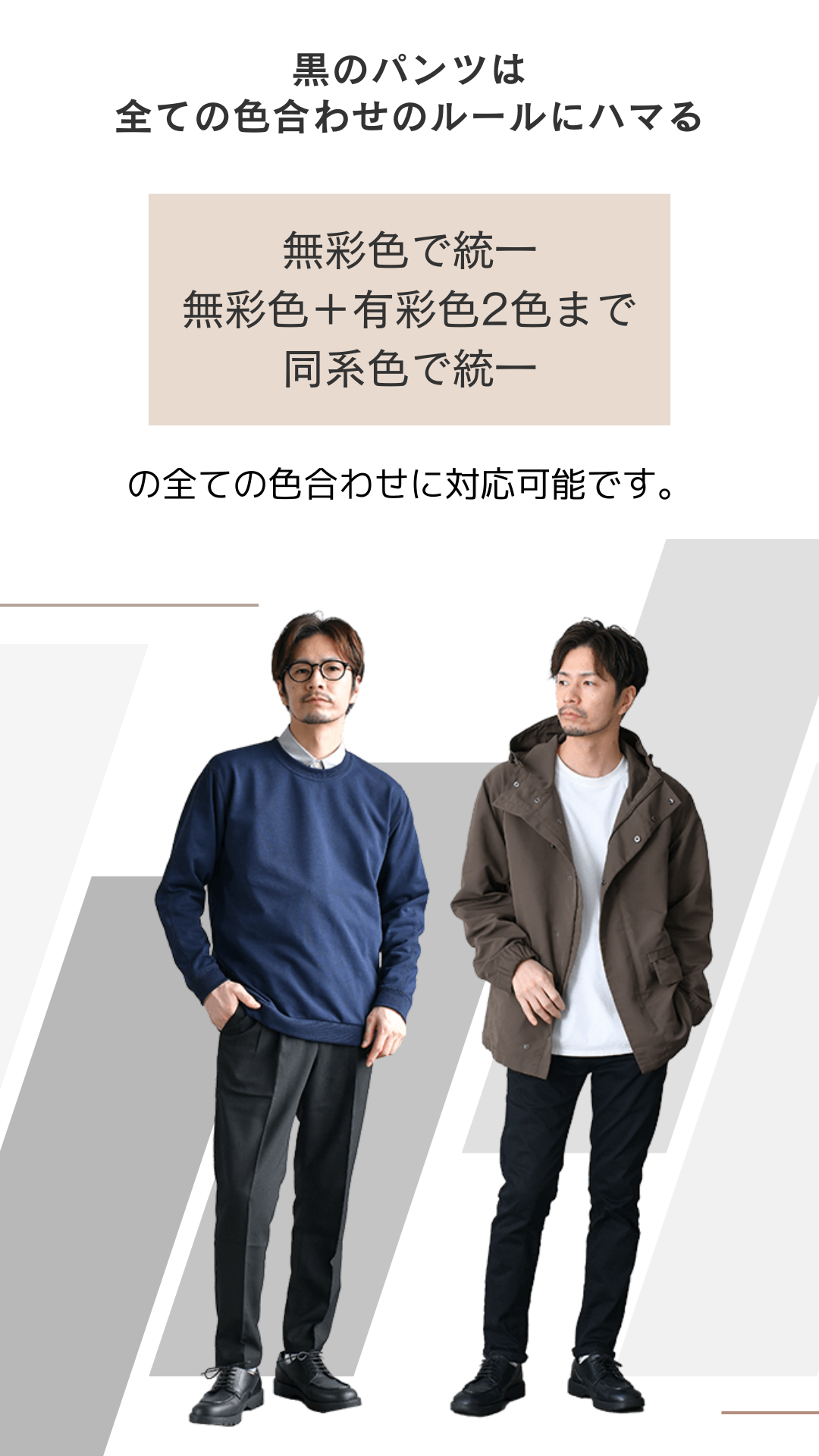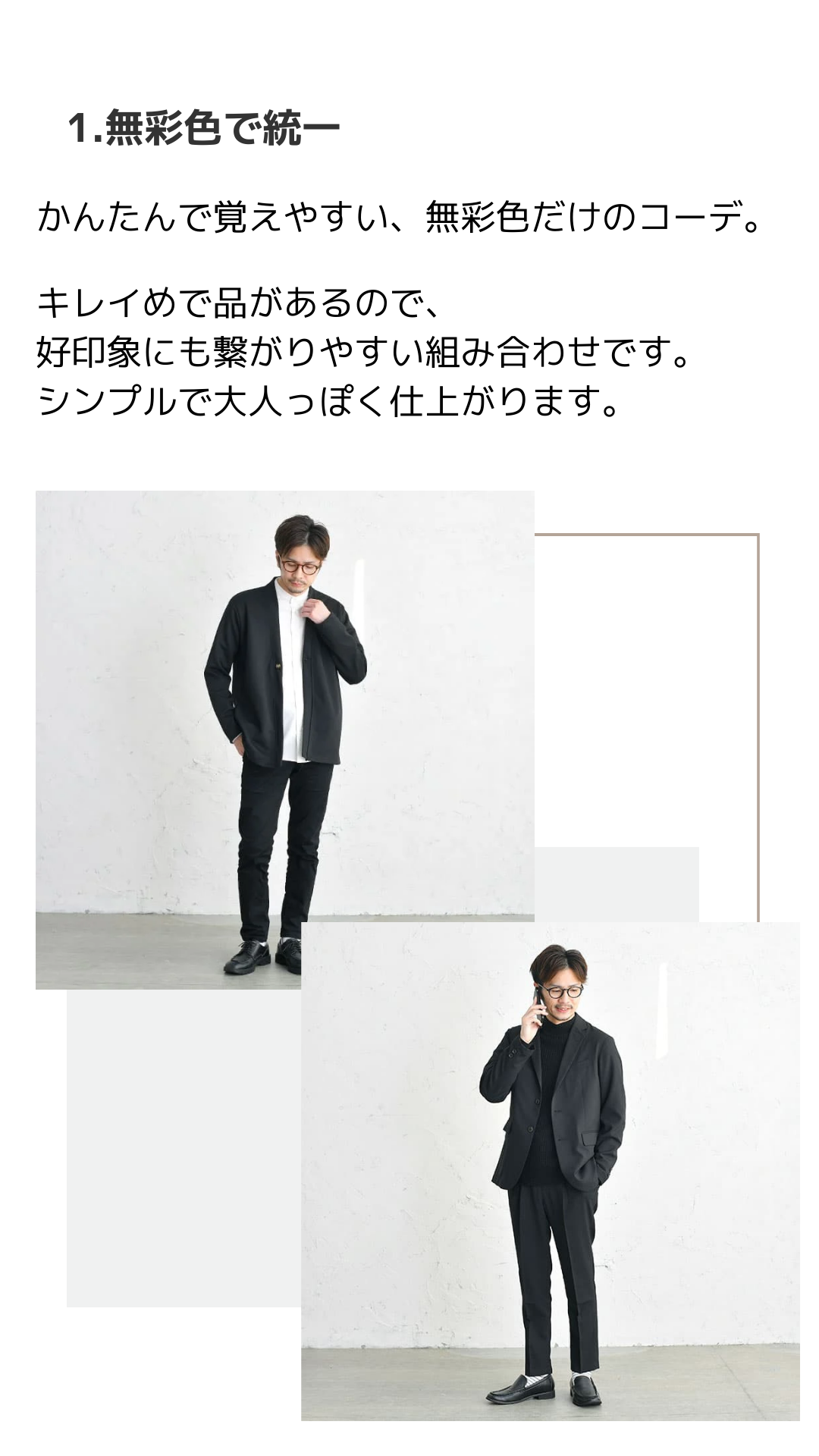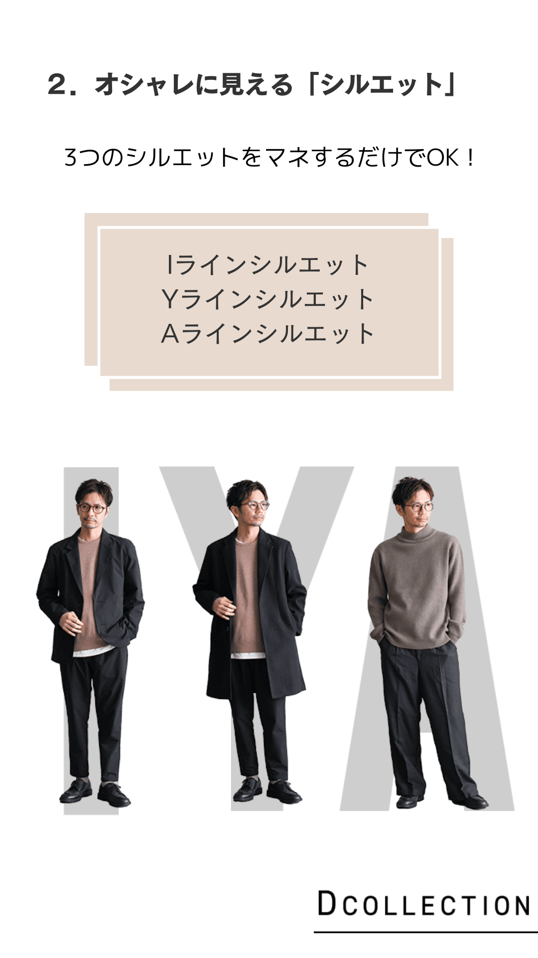 FASHION BASIS SECTION1 大人のオシャレに必要なこと 「最近、自分のファッションがしっくりこない」 「忙しくてオシャレに気を配る時間がない」 そんな風に感じたことはありませんか? もしそうだとしたら今こそ、魅力的な大人のオシャレをする絶好のタイミングです。 若い頃の服を続けると 「おじさん化」してしまう 若い頃と同じ服を着続けていると、年齢とともにそのスタイルが時代遅れに見えてしまいます。トレンドや価値観が変わっていく中で、過去の感覚に固執していると、周囲からおじさん化して見られるようになってしまいます。 大人の魅力を引き出すチャンス しかし今、あなたが「価値観」を更新し、ファッションの力で周囲からの印象を一変させるチャンスです。大人の魅力を引き出し、周りの人から「オシャレですね」「素敵ですね」と思われるようなスタイルを手に入れましょう。 私たちの実績 初めまして、私たちは会員登録33万人、アプリダウンロード40万件のファッションブランドを運営しています。(2024年8月時点) これからファッションのプロである私たちが「オシャレの原理原則」を紹介します。 大人のオシャレに必要なのは 2つの原理原則 調和は人間の本能的な美の基準です。 例えば芸術の分野では、黄金比と呼ばれる視覚的な調和が保たれ、そのデザインが美しいとされています。 社会では、礼儀作法によって人との関係や状況に社会的な調和が保たれ、その姿が美しいとされています。 2つの原理原則とは? ファッションも同じで調和のとれたコーディネートがオシャレ、魅力的とされています。 調和のとれたコーディネートに必要なのは「2つの原理原則」です。 2つの原理原則を満たせば、自動的に調和のとれたシルエットや色のバランス、TPOに合った装いが完成し美しいと感じさせます。 2つの原理原則を理解し実践するだけで自然に周囲から「オシャレだな」と思われるようになるのです。 高価な服は必要ない 「大人のオシャレな服は高いんじゃない?」と心配するかもしれませんが、高い服を買えばオシャレになれるわけではありません。全身2万円以内でも、2つの原理原則を押さえれば、あなたは間違いなく洗練された大人のオシャレを手に入れられます。 原理原則の続きは公式LINEで ここまでお読みいただき、ありがとうございます。 2つの原理原則の詳細を解説する「SECTION2以降」は、LINE公式アカウントで友だち登録された方限定で無料でお読みいただけます。 さらに、LINEではあなたにおすすめのコーディネート例や、大人が最初に買うべき洋服も知ることができます。 今すぐ友だち登録をして、オシャレをさらにレベルアップしましょう! LINEで友だち登録する