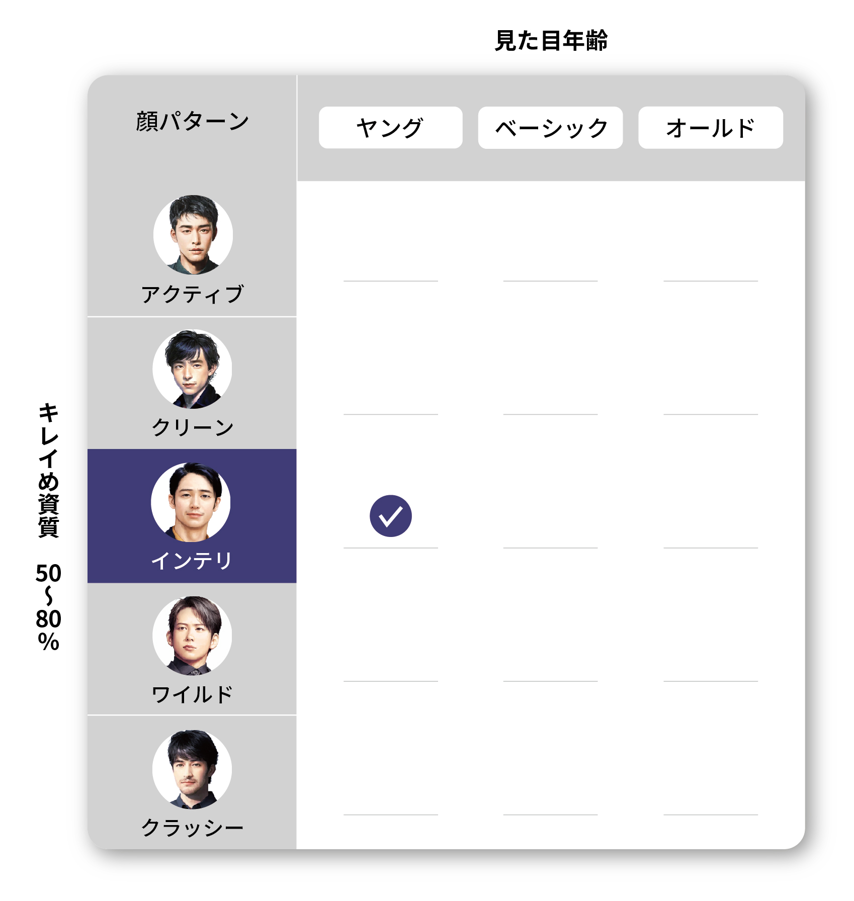顔パターン診断結果 あなたの顔パターンは ヤングインテリ 見た目年齢 ■見た目年齢■歳 顔の印象 ■顔パターン■ 体型 ■体型■ 顔の特徴 明確な輪郭とキリッとした目元で、大人の洗練さと若さのエネルギーが調和しています。お顔立ちの雰囲気に近い着こなしをすることで、さらに魅力を底上げすることができますよ。 見た目年齢 実年齢よりも若々しい外見を持ちながら、シャープな美しさと知的な雰囲気が混在しているお顔立ちです。 芸能人 松田翔太 佐々木蔵之介 藤木直人 綾野剛 玉木宏 etc 似合うカラー 知的な印象や落ち着きのある雰囲気をお持ちのインテリさんには、クールで落ち着いた色合いや少し暗めのトーンがお似合いになります。 シャープ大人っぽい洗練賢明さ 似合うコーディネート あなたの顔のキレイめ資質 そんなあなたにピッタリの着こなし スーツスタイルに近いキレイめなIラインシルエットを構築したスタイル 華やかになりすぎないモノトーン(+有彩色1色)の色合わせ シャツなどのキレイめのトップスにスキニーやデニムなど、カジュアル要素を含むアイテムを合わせる コーディネート一覧 とことんシンプルなファッションがお得意のインテリさん。ずばり「ジャケットセットアップ」があなたのマストアイテムです。細身のトップスとパンツで作り出すIラインシルエットが持ち前のカッコよさを強調。 落ち着いた雰囲気のあるインテリさんは、華やかになりすぎないモノトーン(+有彩色1色)の色合わせが大勝利。特に「グリーン」や「ネイビー」などの寒色はあなたの魅力をグッと引き立ててくれますよ。 インテリパターンがカジュアルスタイルを楽しむときのコツはリラックス感が出過ぎないこと。シャツなどのキレイめのトップスにカジュアルなスニーカーを合わせたコーデがとってもお似合いです♪ 【送料無料】テーパードパンツ 第一印象がガラッと変わる!大人の男性がまず最初に揃えるべきアイテムです。 商品を見る いま売れているアイテムをお気に入り登録しよう あなたにおすすめしたいアイテムをご用意しました。気に入ったアイテムはどんどんお気に入り登録しよう! お気に入りアイテムを探しにいく