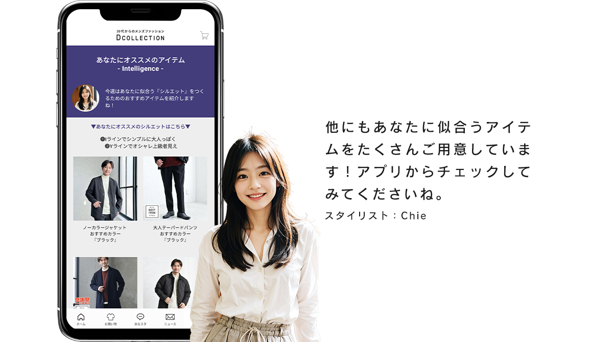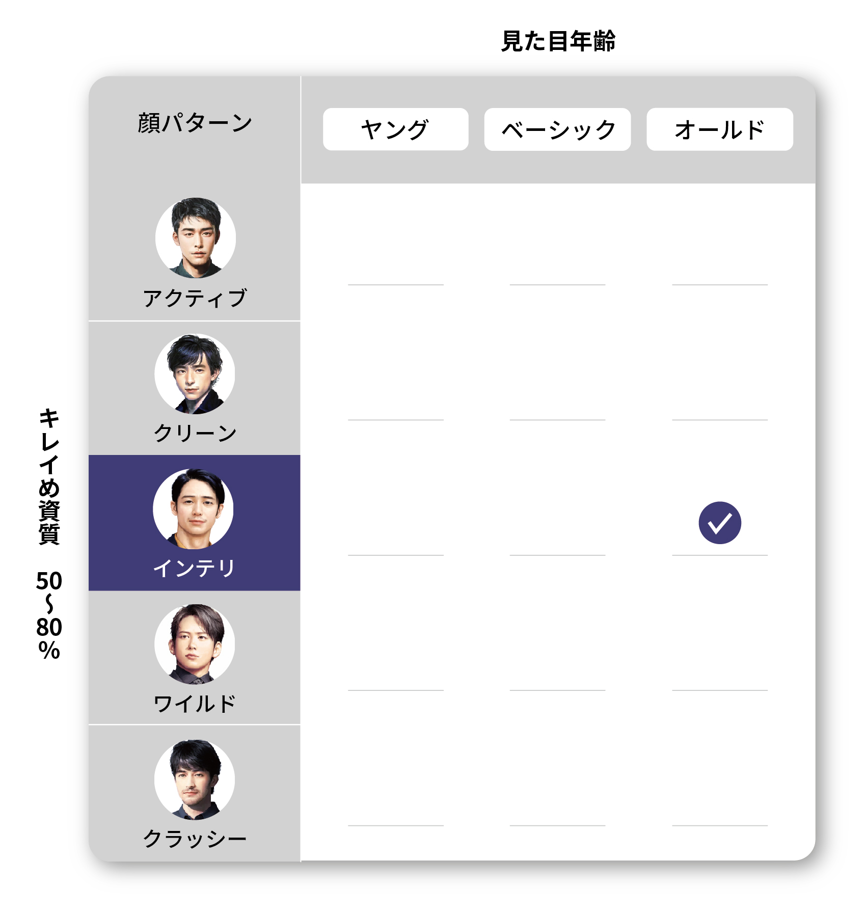 顔パターン診断結果 あなたの顔パターンは オールドインテリ 見た目年齢 ■見た目年齢■歳 顔の印象 ■顔パターン■ 体型 ■体型■ 顔の特徴 顔のバランスが整いつつ、その中でも特に知的な雰囲気が際立つお顔立ち。輪郭が鋭く、シャープな美しさを持ち、その存在感は洗練された印象を強く感じさせます。 見た目年齢 知性と洗練さを兼ね備え、実年齢よりも見た目が成熟しています。 芸能人 松田翔太 佐々木蔵之介 藤木直人 綾野剛 玉木宏 etc 似合うカラー 知的な印象や落ち着きのある雰囲気をお持ちのインテリさんには、クールで落ち着いた色合いや少し暗めのトーンがお似合いになります。 シャープ大人っぽい洗練賢明さ 似合うコーディネート あなたの顔のキレイめ資質 そんなあなたにピッタリの着こなし スーツスタイルに近いキレイめなIラインシルエットを構築したスタイル 華やかになりすぎないモノトーン(+有彩色1色)の色合わせ シャツなどのキレイめのトップスにスキニーやデニムなど、カジュアル要素を含むアイテムを合わせる コーディネート一覧 スーツスタイルに近いキレイめなIラインシルエットを構築したスタイル とことんシンプルなファッションがお得意のインテリさん。ずばり「ジャケットセットアップ」があなたのマストアイテムです。細身のトップスとパンツで作り出すIラインシルエットが持ち前のカッコよさを強調。柄入りのジャケットや重ね着スタイルは、あなたの洗練された雰囲気にマッチします。 使用アイテム 商品を見る 商品を見る 商品を見る 華やかになりすぎないモノトーン(+有彩色1色)の色合わせ 実年齢よりも上に見られることが多く、落ち着いた雰囲気のあるインテリさんは、華やかになりすぎないモノトーン(+有彩色1色)の色合わせが大勝利。特に「グリーン」や「ネイビー」などの寒色はあなたの魅力をグッと引き立ててくれますよ。 使用アイテム 商品を見る 商品を見る 商品を見る シャツなどのキレイめのトップスにスキニーやデニムなど、カジュアル要素を含むアイテムを合わせる インテリパターンがカジュアルスタイルを楽しむときのコツはリラックス感が出過ぎないこと。ロングコートやシャツなどのキレイめのトップスにカジュアルなスキニーを合わせたコーデがとってもお似合いです♪インナーはダーク色でまとめてモードな印象を強調するのもあり♪ 使用アイテム 商品を見る 商品を見る 商品を見る アイテム紹介 最初に買うべきアイテム 似合うアイテム コーデセット まず最初に買うべき大人テーパードパンツ 第一印象をガラッと変えたいならまずはこちらのパンツをお試しください。普段穿いているパンツから穿きかえるだけで、簡単にオシャレな着こなしを作ることができます! 商品を見る 大人のスラックスパンツ オンでもオフでも使えるキレイめ度の高いスラックスパンツはインテリさんにイチオシのパンツです。デニムライクな生地なので、ドレッシーになりすぎないところが合わせやすさのポイント! 商品を見る パンツは全体の印象の5割を決める重要なアイテム。パンツを変えるだけで、コーディネート全体の印象が大きく変わります。なのでAUEN(旧:DCOLLECTION)ではパンツを強くオススメしています。 大人のリラックスノーカラージャケット シャープでリラックス感のあるアイテムを得意とするので、ノーカラージャケットはピッタリですよ。専用のパンツを組み合わせることで、あとはインナーを選ぶだけのセットアップコーデが手軽に作れます! 商品を見る 大人のミラノリブニット 落ち着いた色味のミッドナイトブルーが、インテリさんの魅力を一層引き立てます。重ね着専用のニットなので、シャツとの組み合わせは特にオススメです! 商品を見る 大人の無地ネルシャツ 知的な雰囲気にまとまるシャツは季節問わずに使えるアイテム!1枚ではもちろん、ニットやカットソーの下に重ねた着こなしも◎防しわ機能付きなところもポイントですよ。 商品を見る アプリからいつでもご確認いただけます! オススメのアイテム一覧へ 何を買おうか迷ってしまうそんなあなたへ!インテリさん専用の全身コーデセットをご用意しています。 手軽さ重視お試し版 全身コーデ3点セット 19,990円(税込) 「まずは手軽に試してみたい」「組み合わせをあれこれ考えたくない」という慎重派さんにオススメ。 商品を見る 見た目重視今年の冬をオシャレに過ごしたい方 全身コーデ5点セット 37,000円(税込) 「手っ取り早くかっこよく仕上げたい」「今年の冬服を探している」「着回ししやすいアイテムだとなお嬉しい」という欲張り派さんにオススメ。 商品を見る