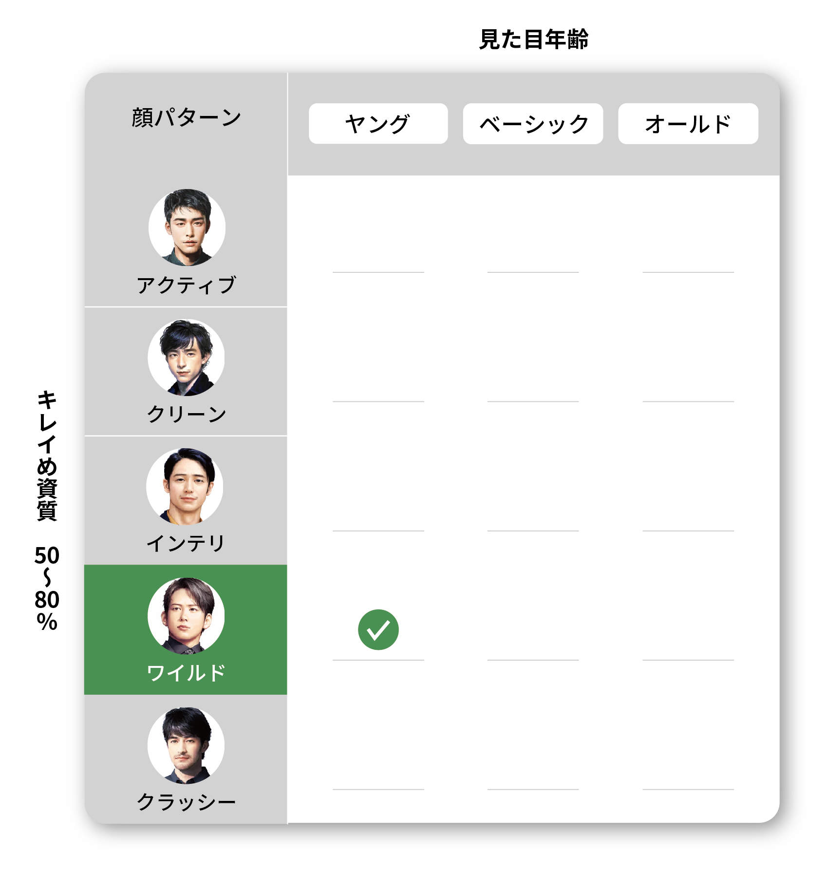 顔パターン診断結果 あなたの顔パターンは ヤングワイルド 見た目年齢 ■見た目年齢■歳 顔の印象 ■顔パターン■ 体型 ■体型■ 顔の特徴 瞳が鋭く、骨格のはっきりした男性らしい印象を持ちます。ファッション選びでは自身のお顔立ちに合ったものを選ぶと、より凛とした雰囲気になります。 見た目年齢 実年齢よりも若く見えるものの、その中にも大人の魅力が垣間見えするお顔立ちです。 芸能人 斎藤工 北村一輝 岡田准一 反町隆史 新田真剣佑 etc 似合うカラー 男性的で力強い印象のワイルドさんには、地の色や深みのあるトーンがお似合いになります。 高級感渋さ硬質力強さ 似合うコーディネート あなたの顔のキレイめ資質 そんなあなたにピッタリの着こなし セットアップで大人っぽくIラインシルエットを構築したスタイル キレイめなモノトーンをベースにしたスタイリング カジュアルアイテムでも、無地のTシャツや装飾のないデニムが似合う コーディネート一覧 セットアップで大人っぽくIラインシルエットを構築したスタイル ”キリっと大人っぽい”ワイルドさんを、さらに魅力的に見せる勝負服はずばりスーツ!身体にフィットする「Iラインシルエット」でその魅力を一層際立たせましょう。あえて決めすぎず、柔らかなニットで抜け感を出すのがオシャレに見せる秘訣です。 使用アイテム 商品を見る 商品を見る 商品を見る キレイめなモノトーンをベースにしたスタイリング 冬の定番、チェスターコートもワイルドさんがカッコよく着こなせるアイテムの一つ!モノトーンがよく似合うワイルドさんは、特に顔周りには得意色を取り入れることで持ち前の男らしい雰囲気とよく合いますよ♪ 使用アイテム 商品を見る 商品を見る 商品を見る カジュアルアイテムでも、無地のTシャツや装飾のないデニムが似合う 大人っぽい服装も、リラックス感のある服装も似合うのがワイルドパターンの強み。リラックス感が強いときは特に派手色や柄物より、シンプルな無地を選ぶとカッコよさが倍増します。襟高のニットやジャストサイズのパンツにサッと黒のアウターを羽織るだけで様になります◎ 使用アイテム 商品を見る 商品を見る 商品を見る アイテム紹介 最初に買うべきアイテム 似合うアイテム コーデセット まず最初に揃えるべき大人テーパードパンツ 第一印象をガラッと変えたいならまずはこちらのパンツをお試しください。普段穿いているパンツから穿きかえるだけで、簡単にオシャレな着こなしを作ることができます! 商品を見る 大人のスラックスパンツ オンでもオフでも使えるキレイめ度の高いスラックスパンツはワイルドさんにイチオシのパンツです。デニムライクな生地なので、ドレッシーになりすぎないところが合わせやすさのポイント! 商品を見る パンツは全体の印象の5割を決める重要なアイテム。パンツを変えるだけで、コーディネート全体の印象が大きく変わります。なのでAUEN(旧:DCOLLECTION)ではパンツを強くオススメしています。 まず最初に揃えるべき大人テーラードジャケット スタイリッシュな着こなしを得意とするので、テーラードジャケットはピッタリですよ。専用のパンツを組み合わせることで、あとはインナーを選ぶだけのセットアップコーデが手軽に作れます! 商品を見る 大人のミラノリブジャケニット 編み目の細かいニットは上品な印象を与えてくれるので、ワイルドさんの魅力を一層引き立ててくれますよ。ネック部分が高めに設計されていることで、より品のある着こなしに仕上がります。 商品を見る 大人のステンカラーコート ロングコートはワイルドさんの得意とするアイテムのひとつです。襟付きのデザインがさらにドレッシー感をアップさせます。コーデ全体が引き締まって見えるチャコールカラーがオススメ! 商品を見る アプリからいつでもご確認いただけます! オススメのアイテム一覧へ 何を買おうか迷ってしまうそんなあなたへ!ワイルドさん専用の全身コーデセットをご用意しています。 手軽さ重視お試し版 全身コーデ3点セット 19,990円(税込) 「まずは手軽に試してみたい」「組み合わせをあれこれ考えたくない」という慎重派さんにオススメ。 商品を見る 着回し力重視季節を気にせず使いたい方へ 全身コーデ5点セット 30,000円(税込) 「せっかく買うなら季節問わず長く使い回したい」「着回ししやすいアイテムがそろってると嬉しい」というこだわり派さんにオススメ。 商品を見る